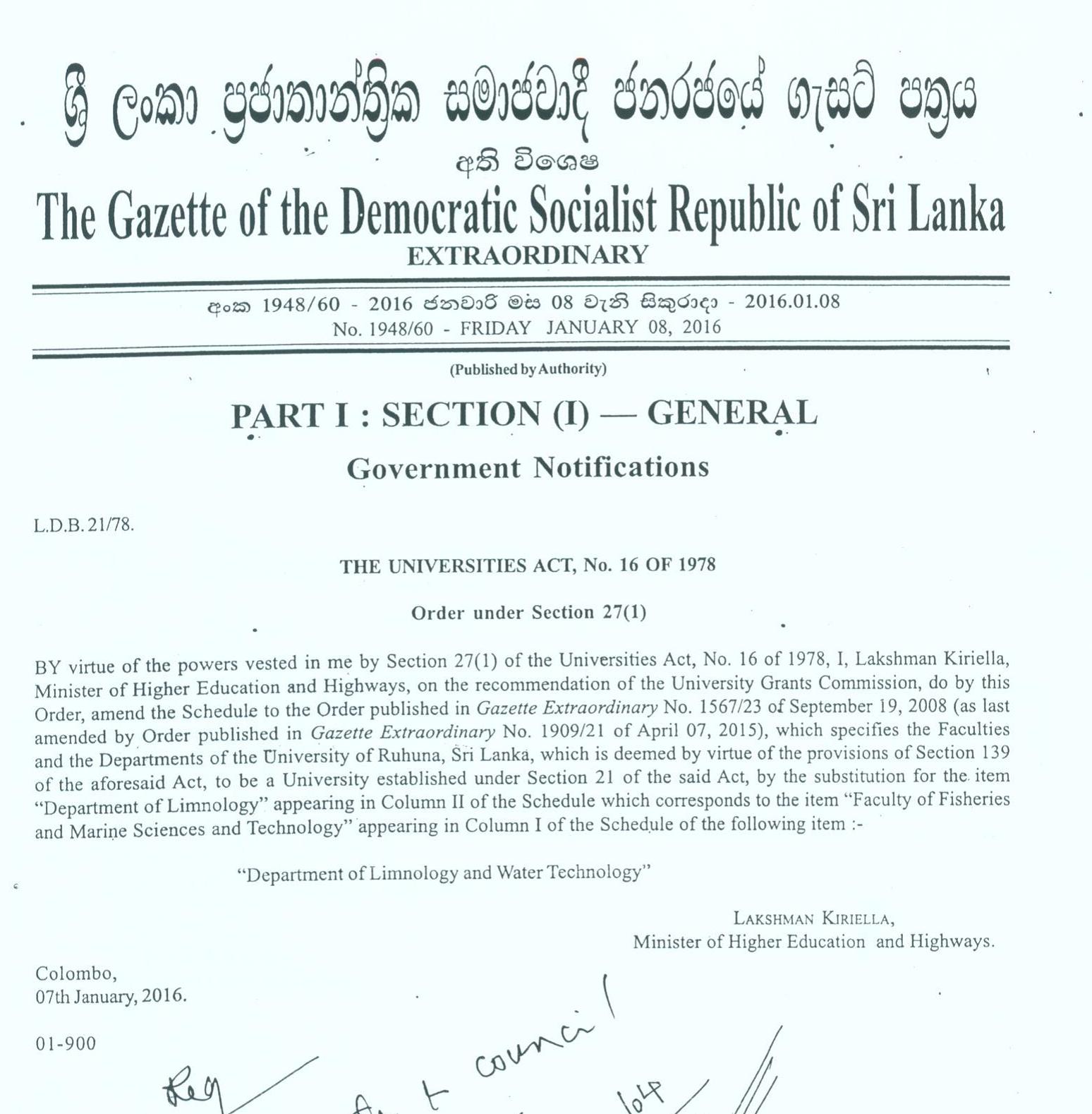 University of Ruhuna was able to introduce, this much needed Faculty of Fisheries and Marine Sciences & Technology,